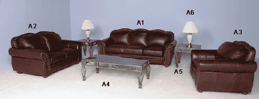 Cognac Leather Upholstery, Sand-Gold Occasional Tables, Beige Swirl Lamps